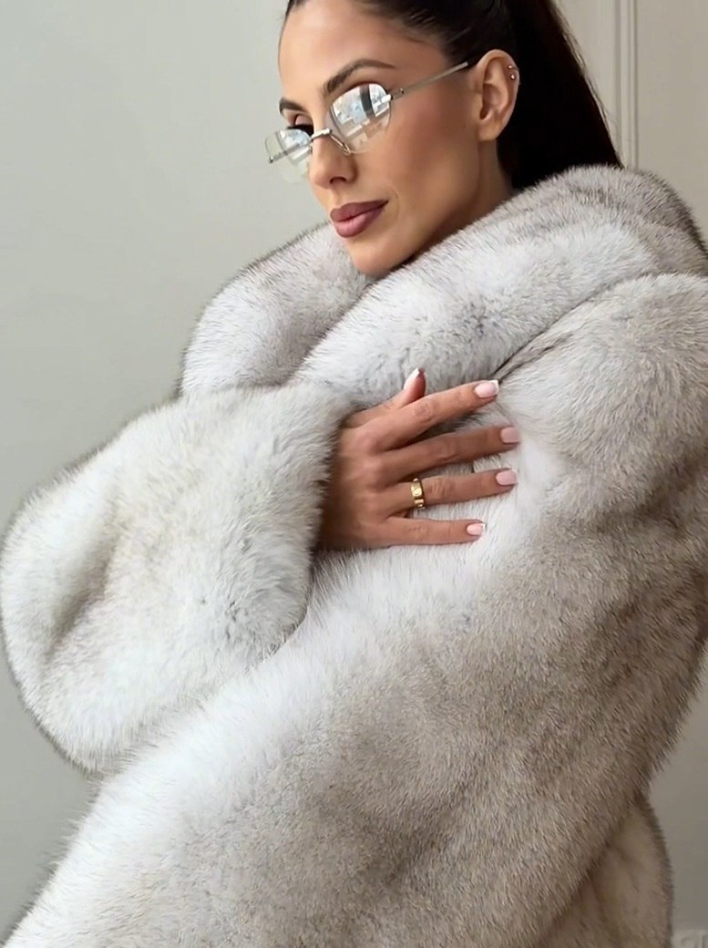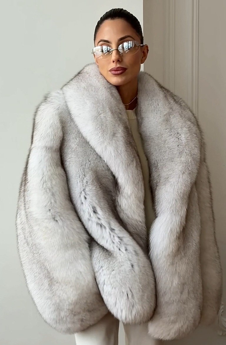Шуба из натурального песца пепельного оттенка. Воротник — шаль