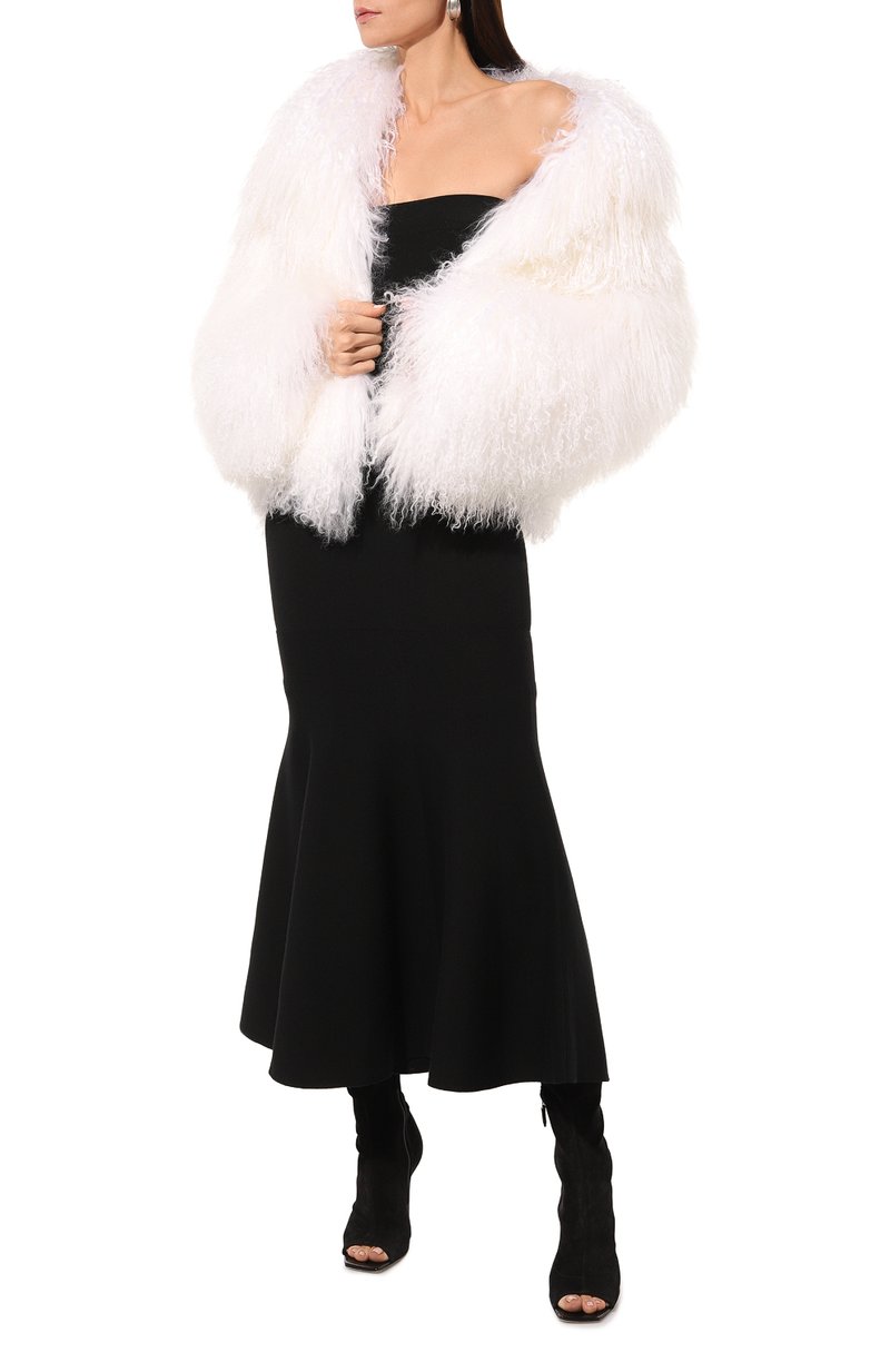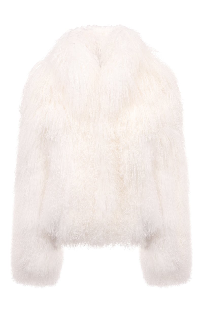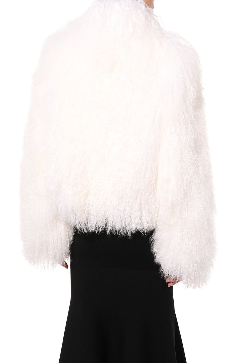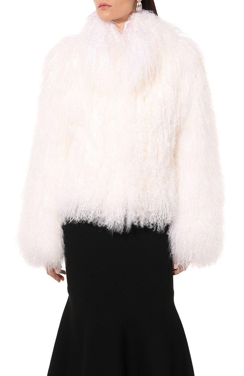 Короткую шубу с отложным воротником выполнили из меха тибетского ягненка. Модель свободного кроя станет отличным завершением и дневного, и вечернего образа.