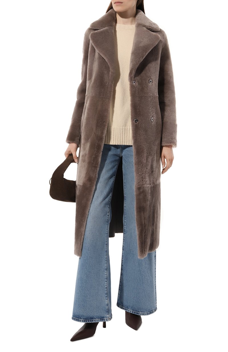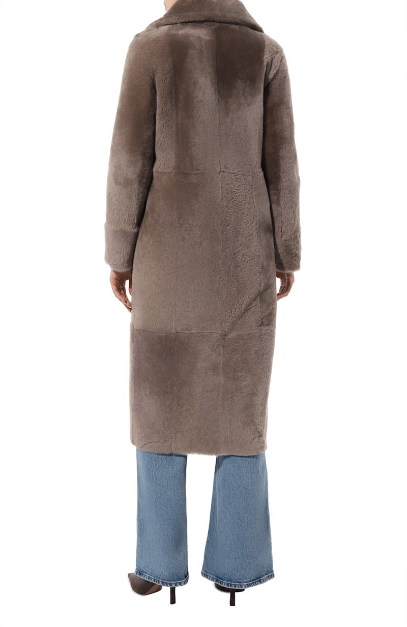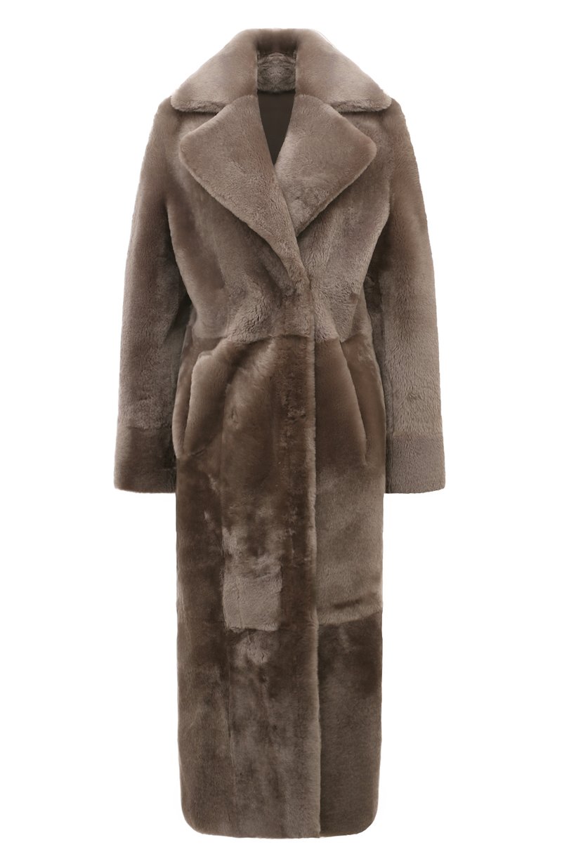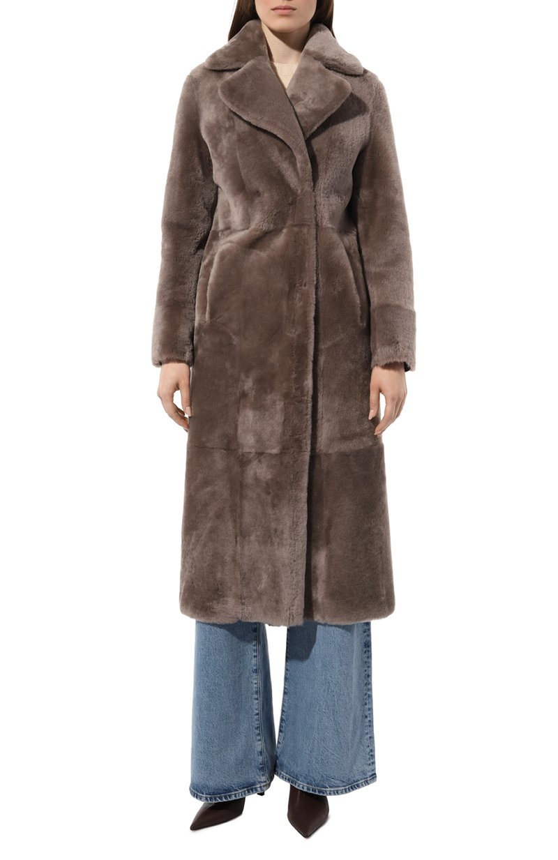 Шуба длиной чуть ниже колен получилась одновременно теплой и почти невесомой. Ее сшили из мягкой пушистой овчины, которую тщательно выделали, чтобы материал стал легче, не утратив природной способности сохранять оптимальный микроклимат. Широкими острыми лацканами модель с боковыми карманами сделали похожей на пальто. Изделие благородного серо-бежевого оттенка застегивается двумя рядами потайных кнопок.