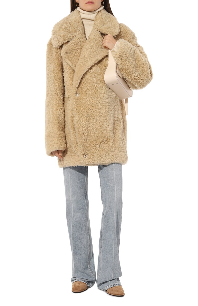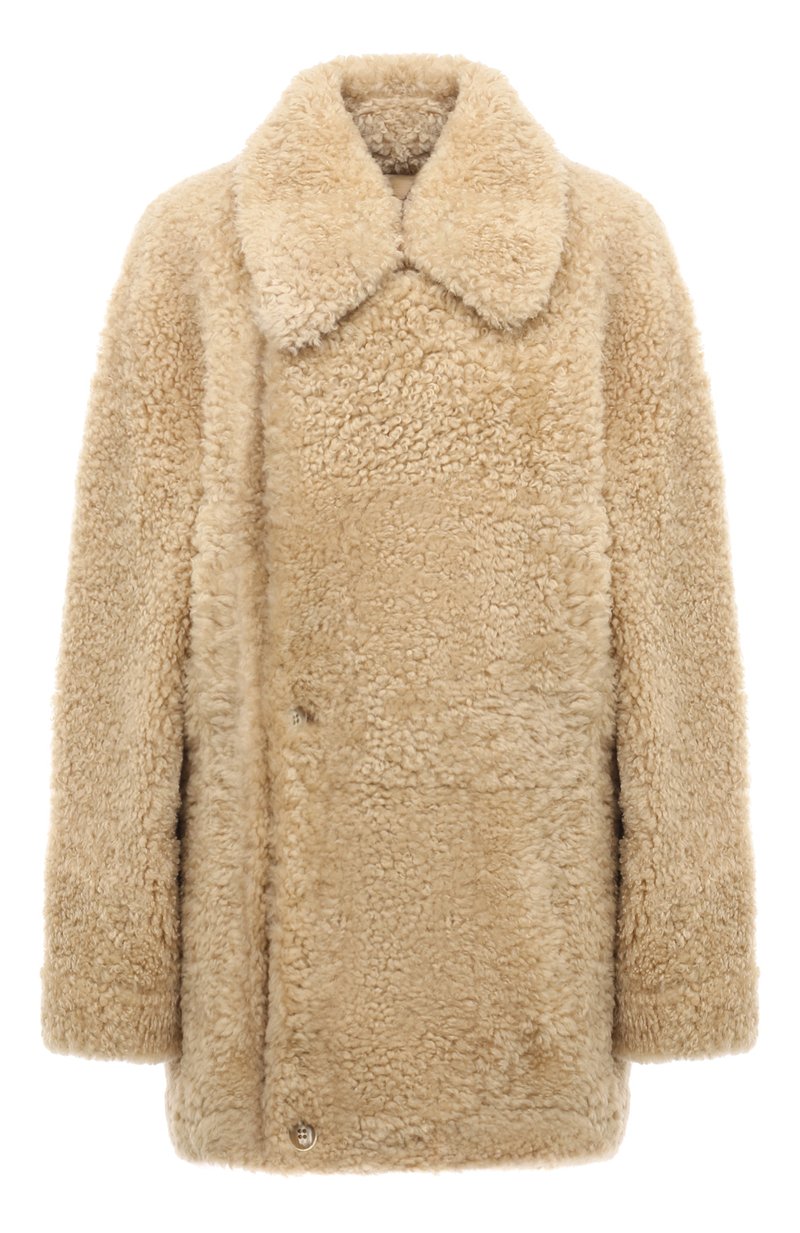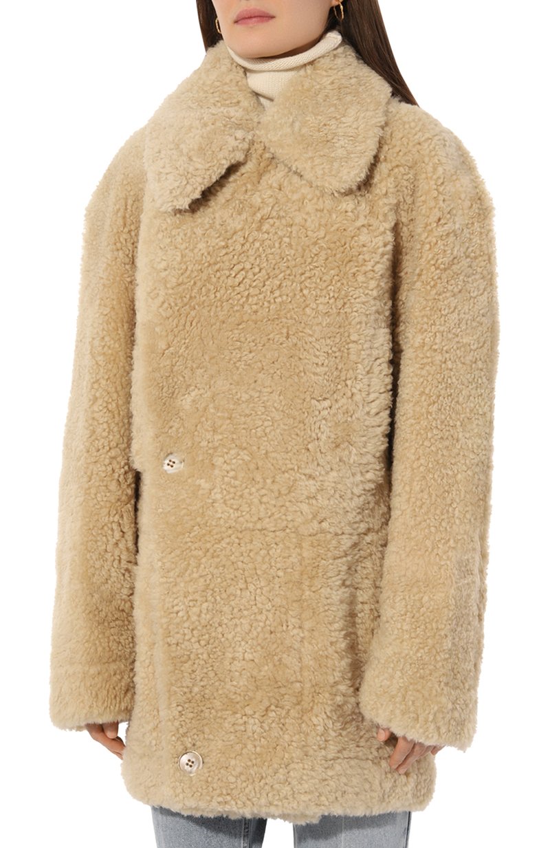 Свободную шубу с широкими лацканами, спущенной линией плеч и двумя боковыми карманами выполнили из мериносовой овчины с коротким мехом. Изделие застегивается смещенными вправо крупными пуговицами.