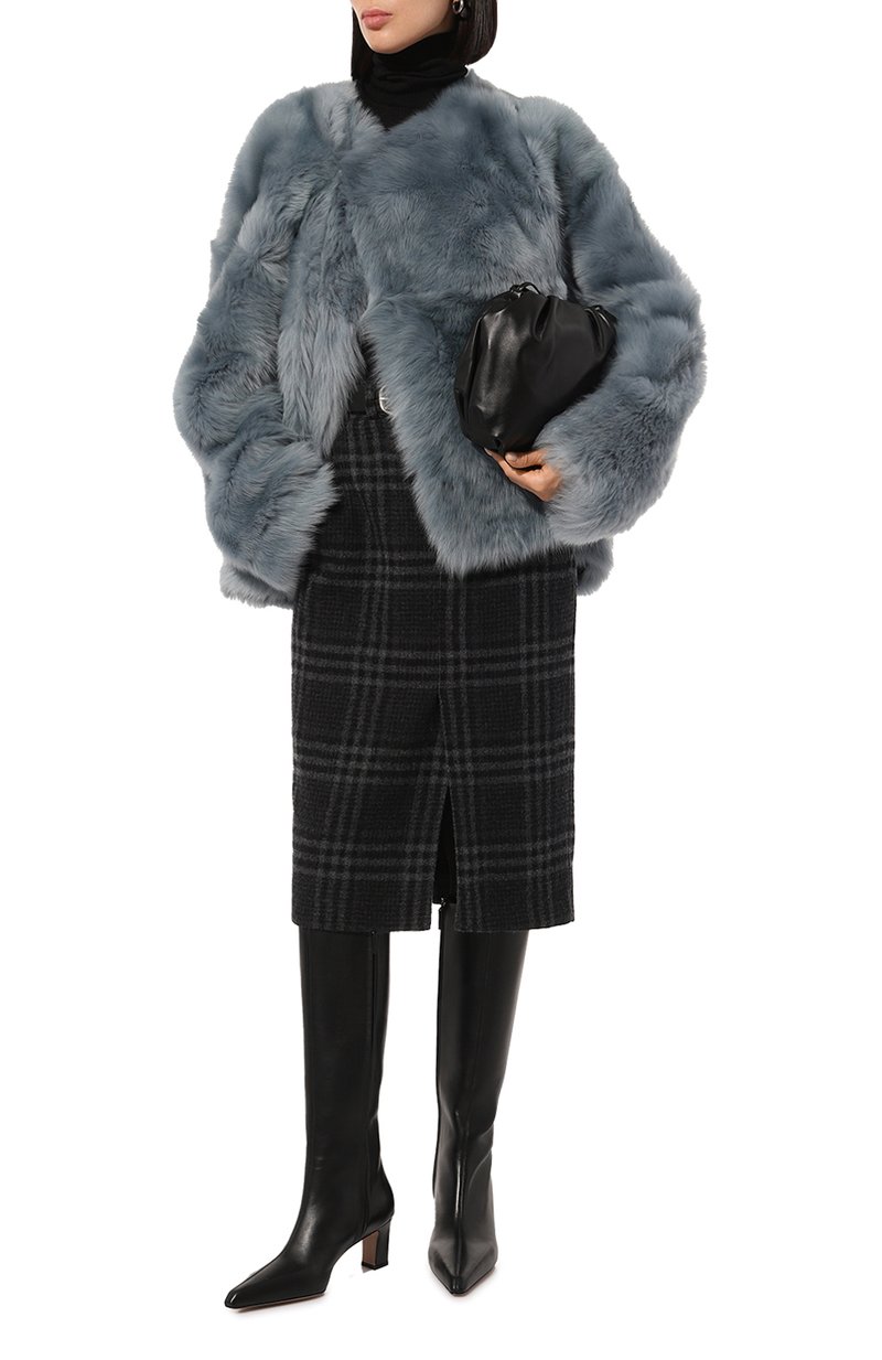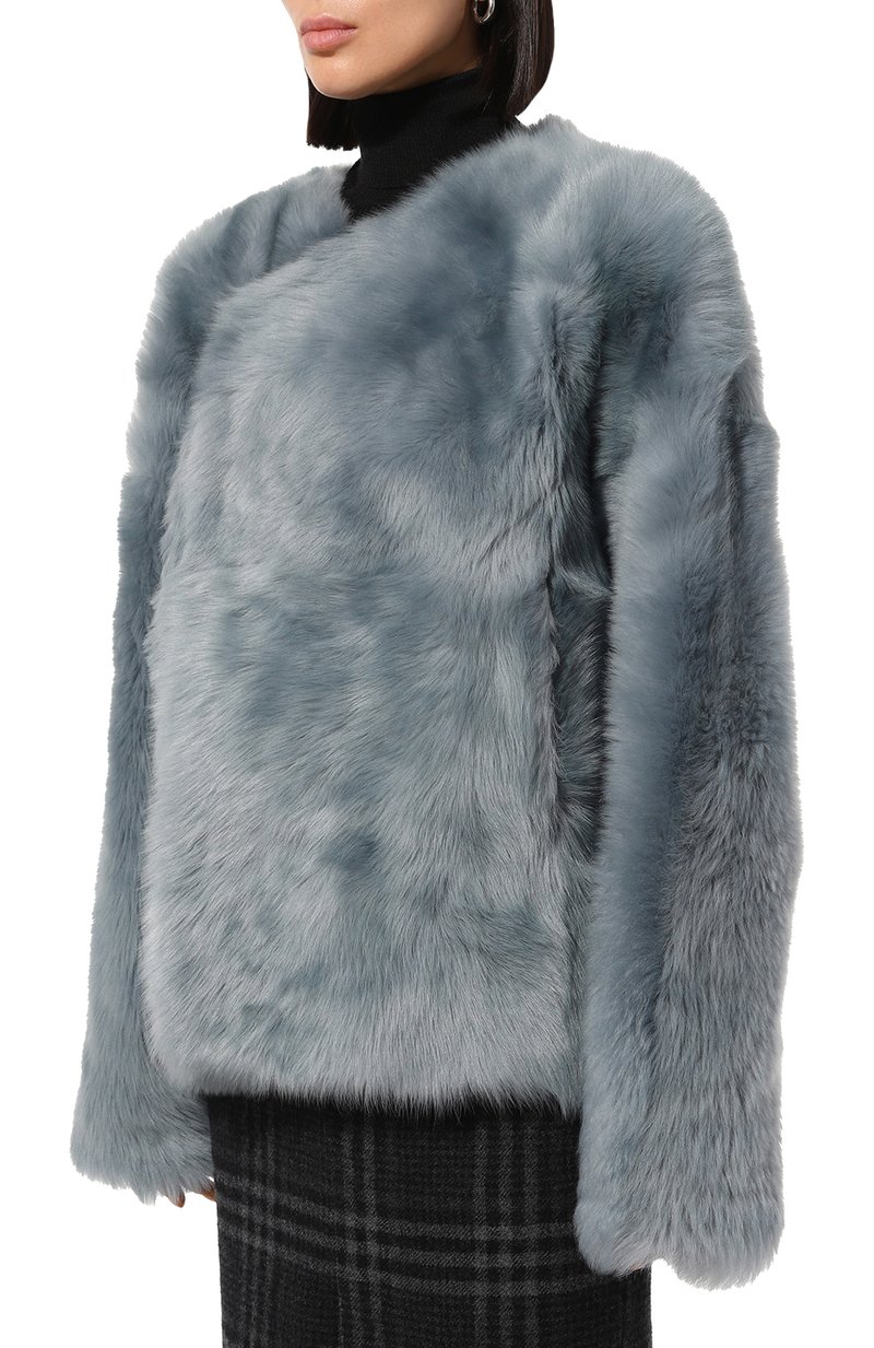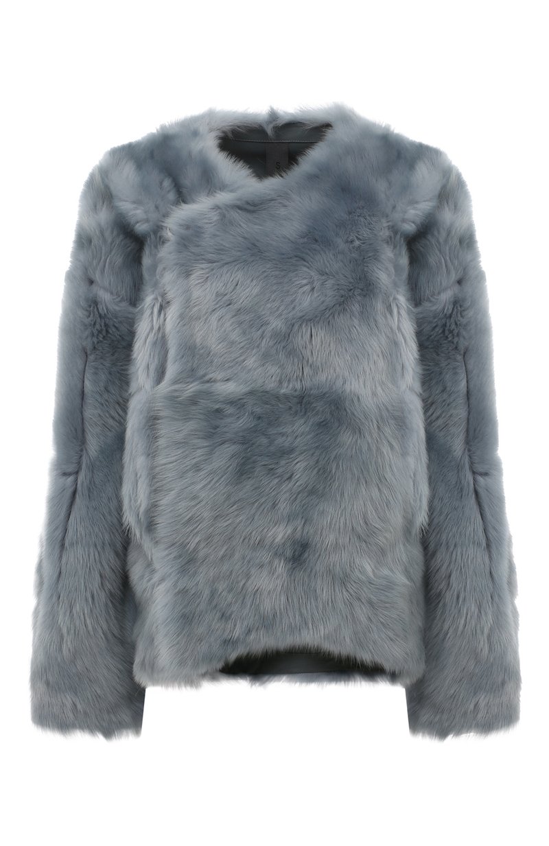 Укороченная шуба с длинными рукавами реглан и двумя врезными карманами выполнена из овчины с густым длинным ворсом. Однотонная модель свободного кроя дополнена асимметричной потайной застежкой на крючок.