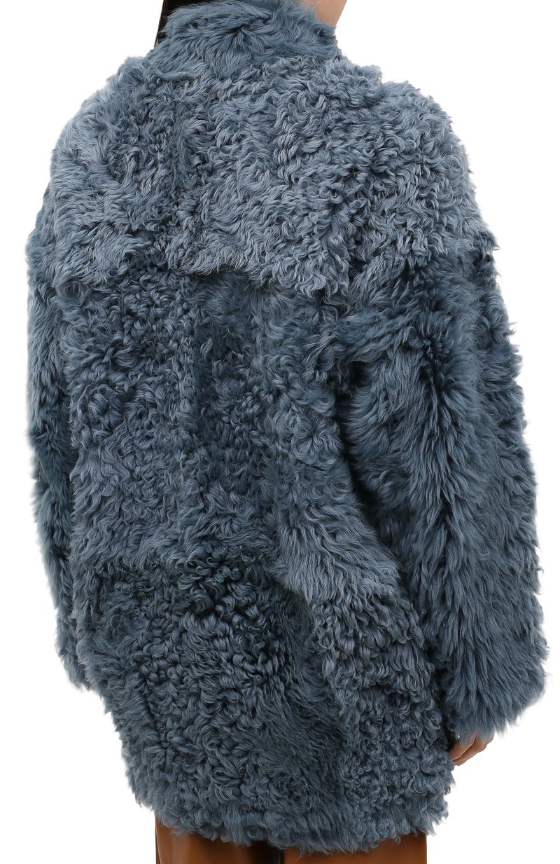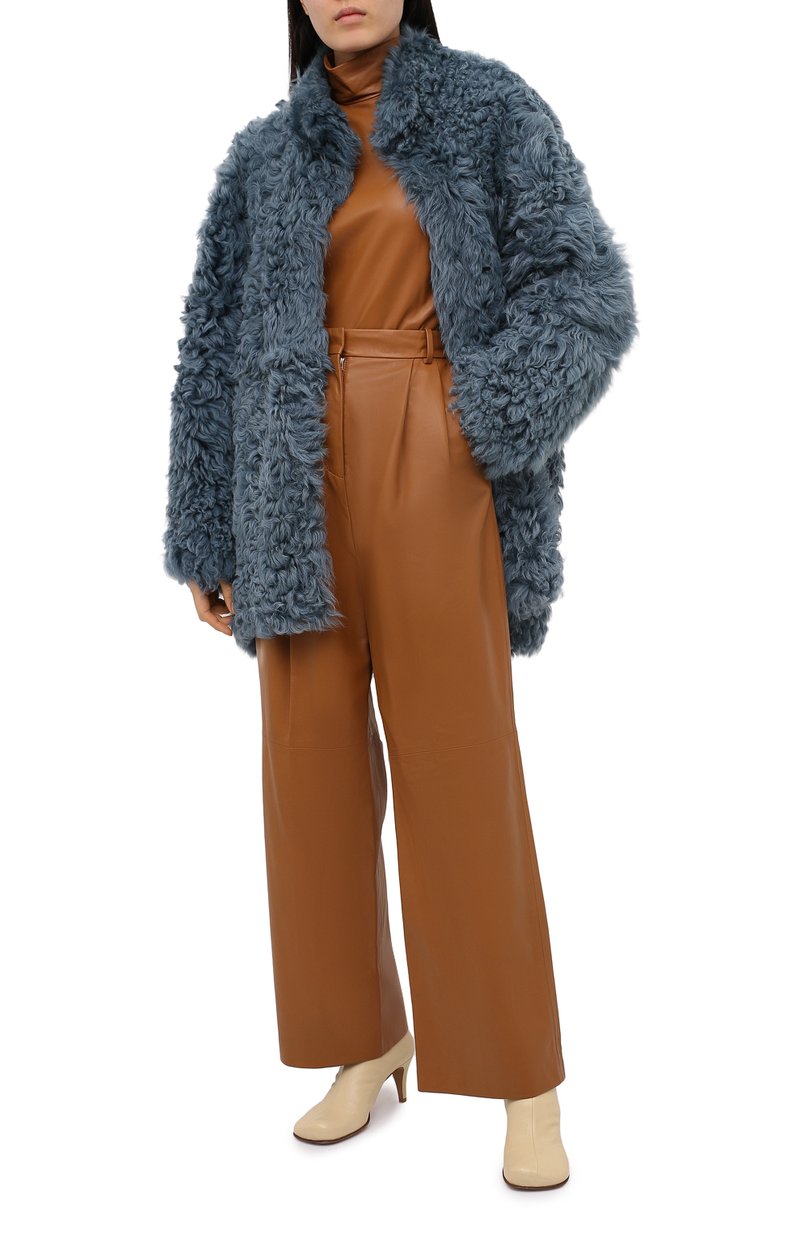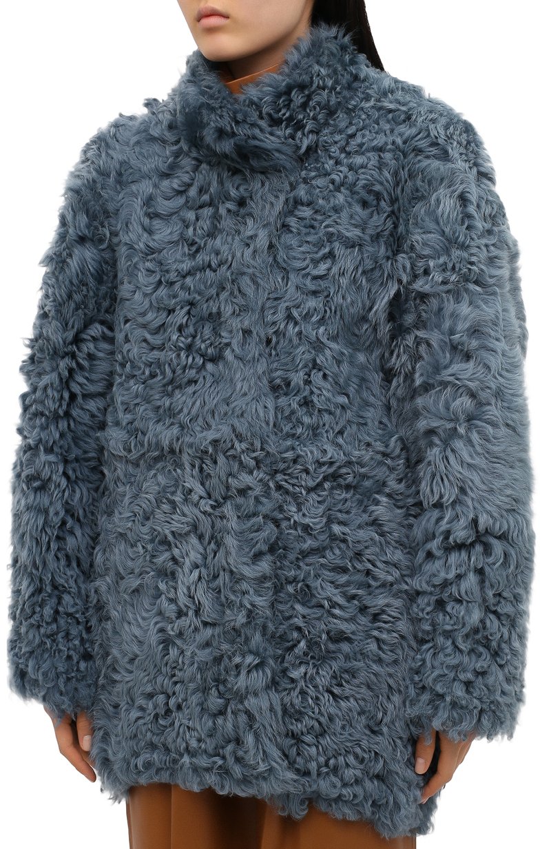 Спокойный бирюзовый оттенок этой шубы из коллекции сезона осень-зима только выиграл от материала. Для пошива модели выбрали густую шелковистую на ощупь овчину со слегка волнистой фактурой. За дополнительную защиту от ветра отвечает высокий воротник-стойка.