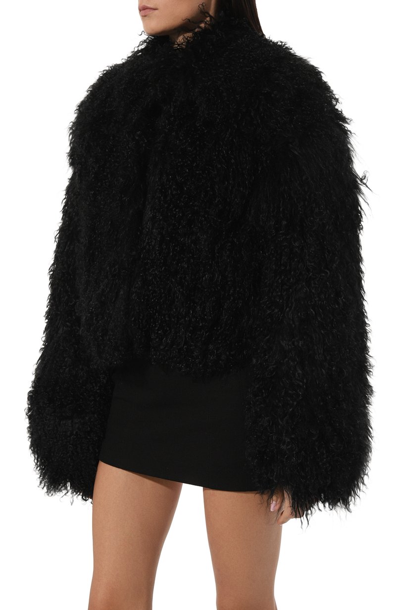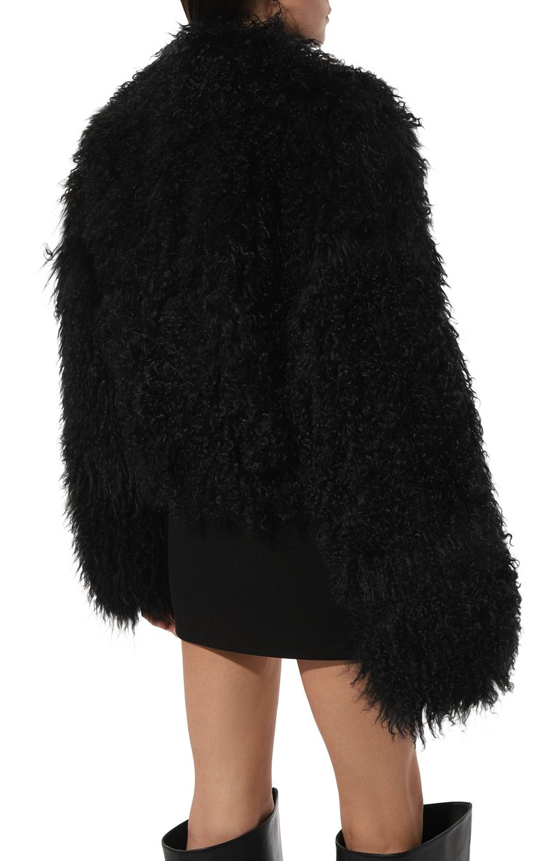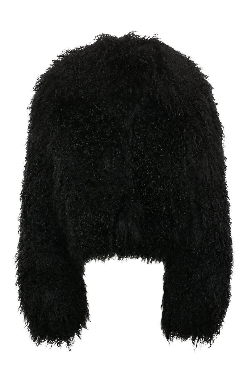 Каскад тонких волнистых прядей угольно-черного цвета наделил эту короткую шубу драматизмом. Команда бренда создала эффектную неровную фактуру, выбрав для пошива прямой модели редкую овчину из высокогорного Тибета. Суровый климат сделал мех овец не только особенно длинным, но и достаточно густым, чтобы в изделии было комфортно в холодные дни.
