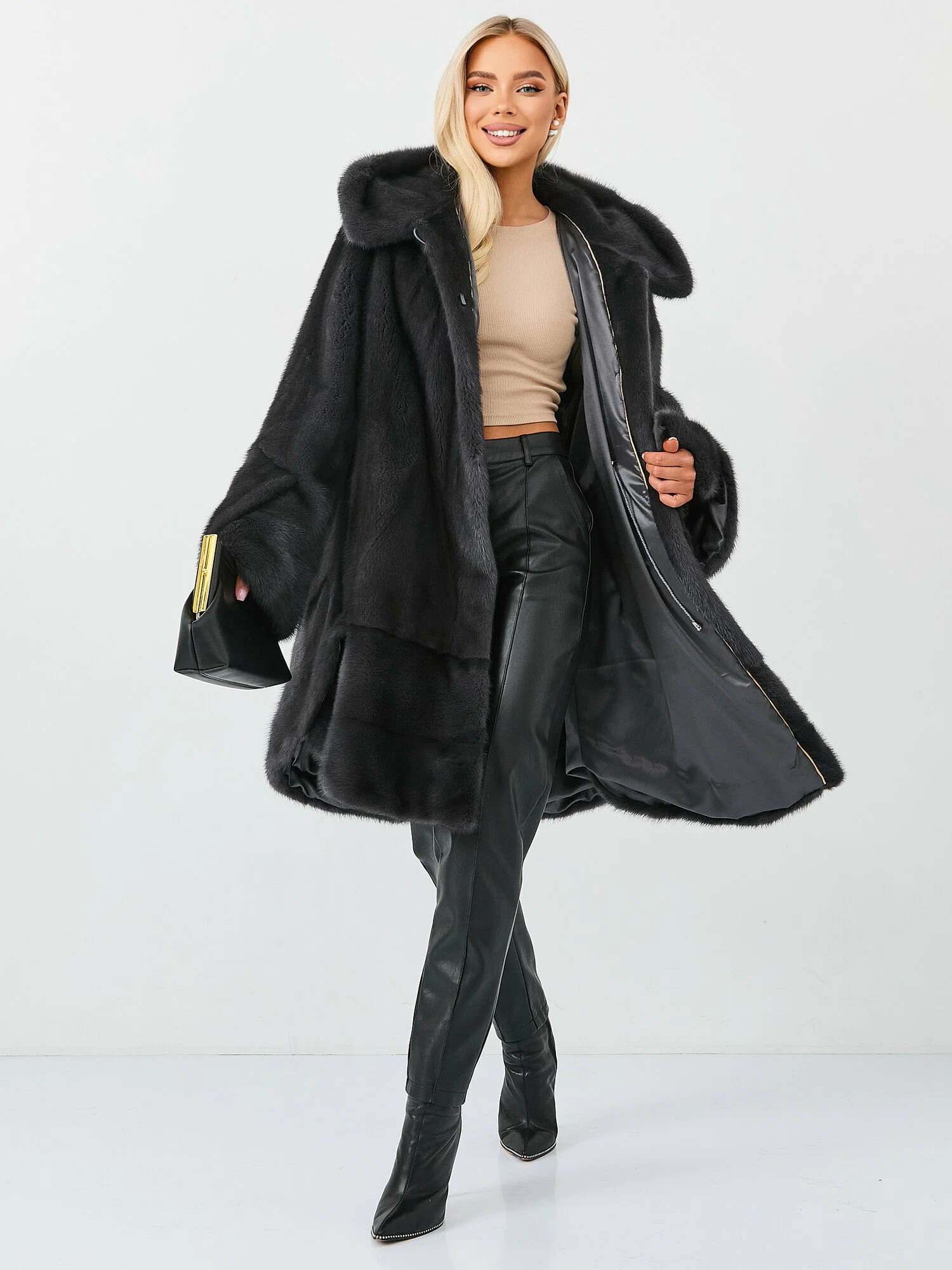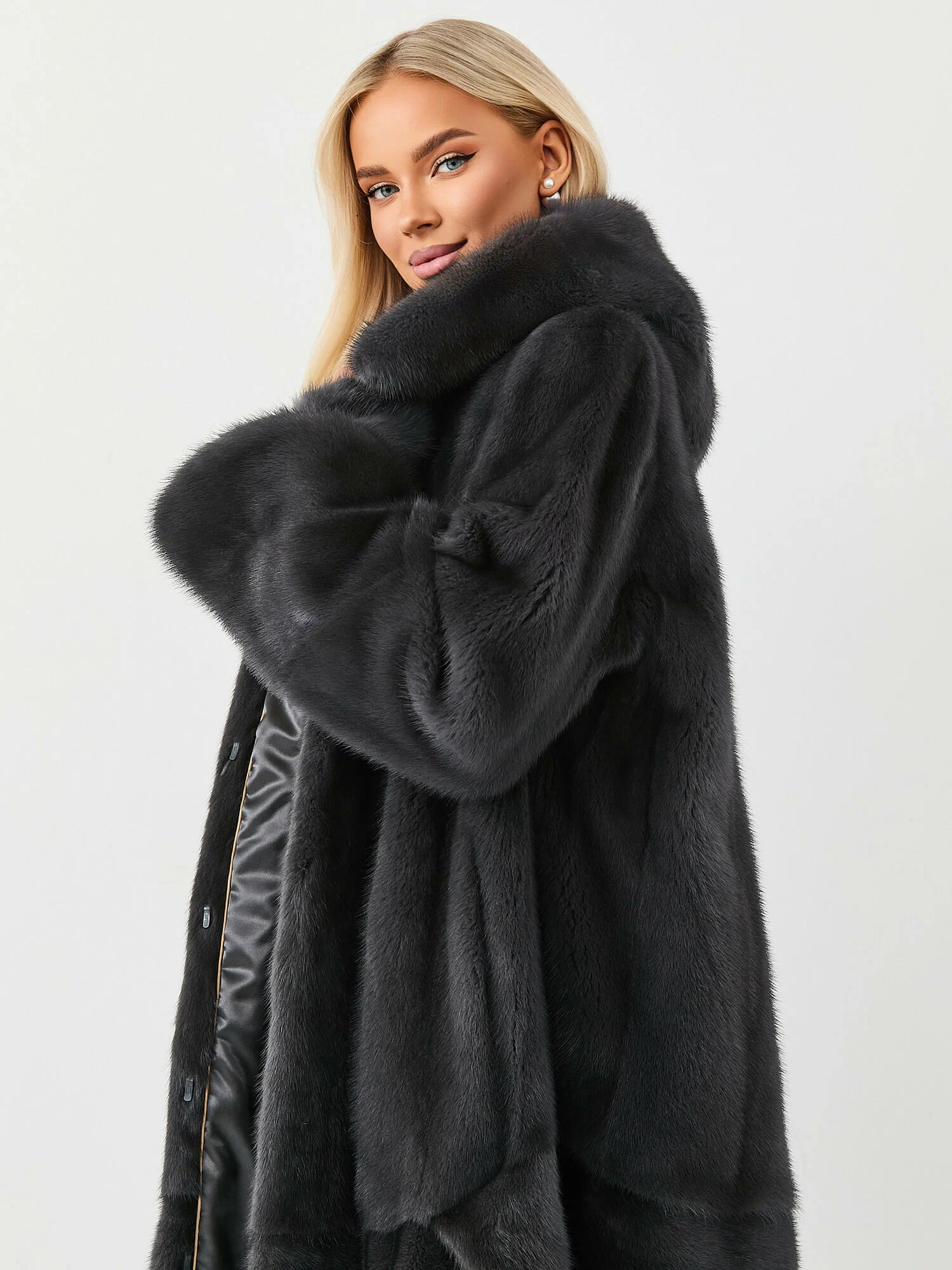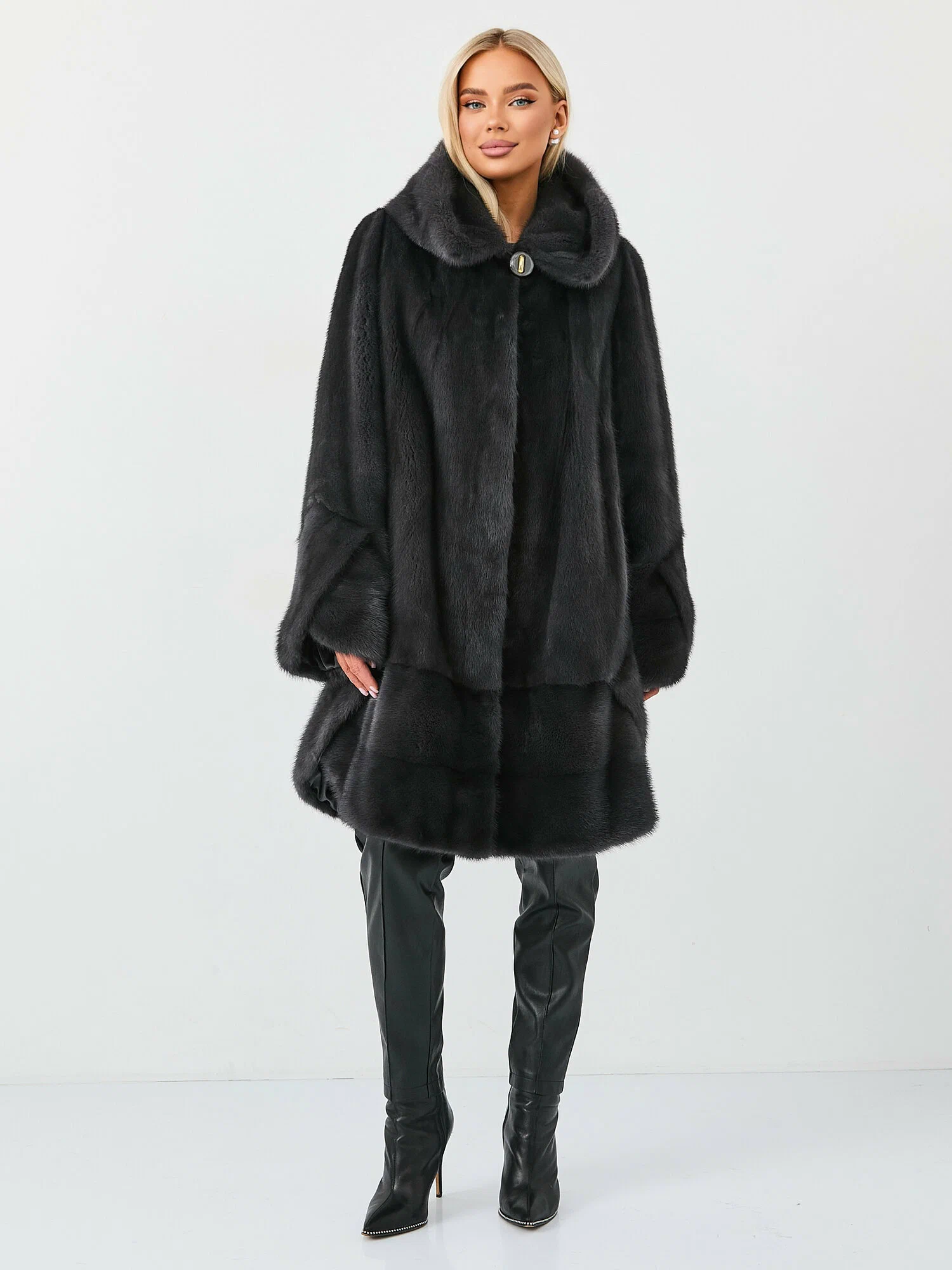 Натуральная норковая шуба в классическом графитовом цвете. Длинная зимняя шубка из меха норки — это модное и стильное изделие для женщин и молодых девушек. Длинная зимняя шубка из меха норки в цвете графит — это модное и стильное изделие для женщин и молодых девушек.
