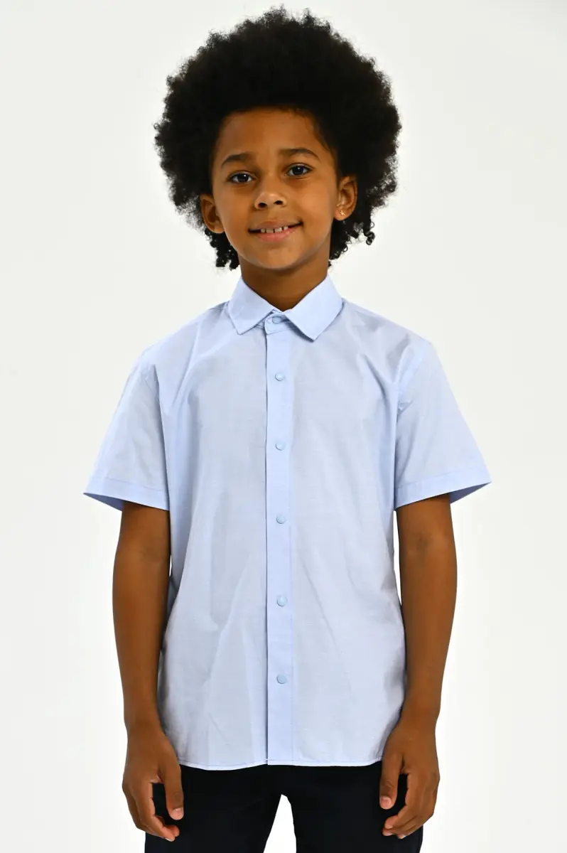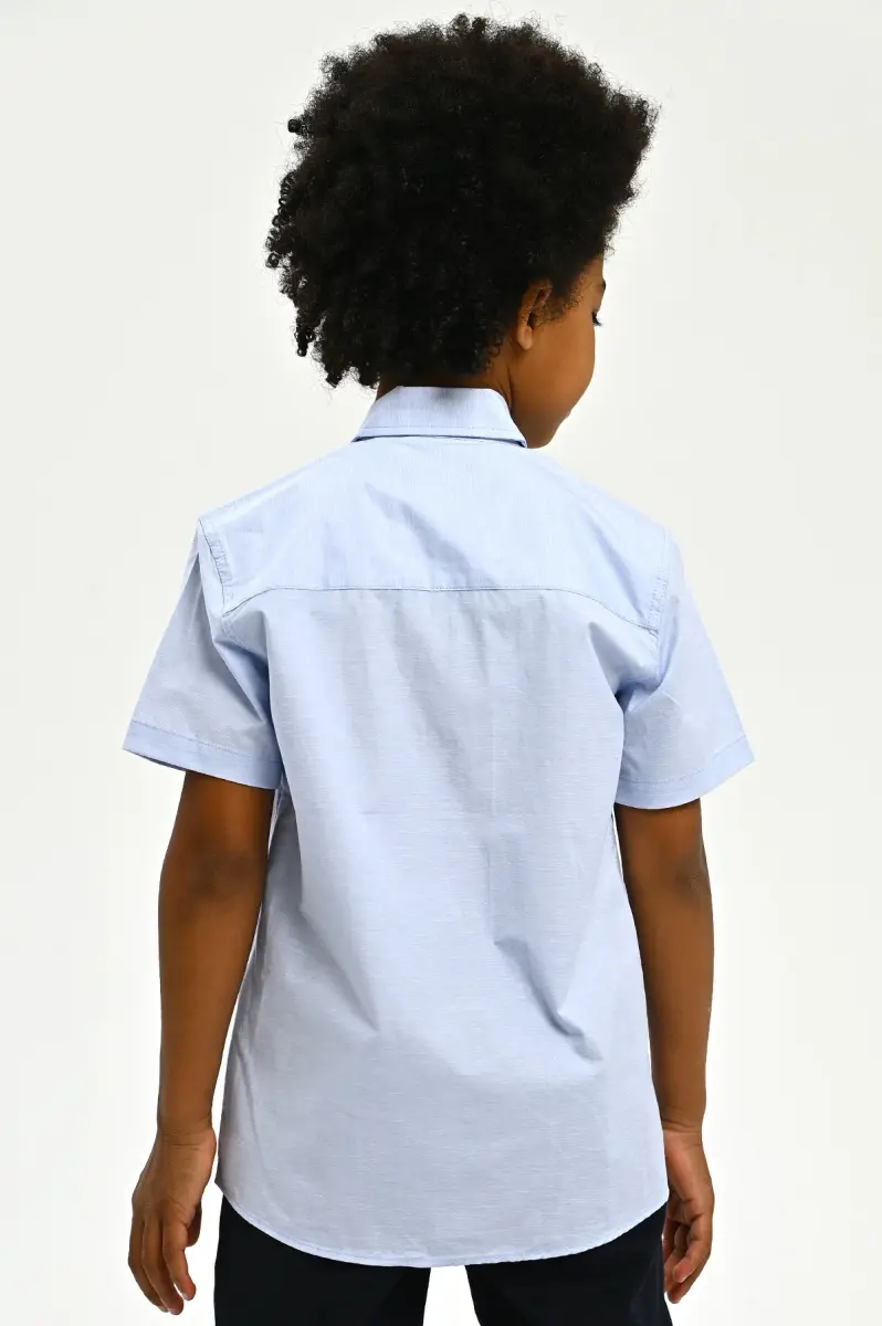 Модель представлена в классическом светло-голубом цвете, что идеально подходит для школьной формы и позволяет сочетать её с различными брюками и свитерами.